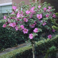 Цветки гибискуса нежно-розового оттенка с ярко-малиновой серединкой, тычинки желтые. Сами цветки довольно крупные, формируются на побегах текущего года.