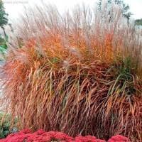Мискантус китайский Ротер Пфейл (высота 160-180 см) - мощный, короткокорневищный, рыхлокустовой многолетний злак с прямостоячими, облиственными в нижней части стеблями. Листья линейные, до 2 см шириной, с толстым ребром посередине, жесткие, шершавые. Осенняя окраска листьев яркая, красно-пурпурная. Соцветия красно-коричневые при распускании, позднее становятся серебристыми. Цветет с августа по октябрь.