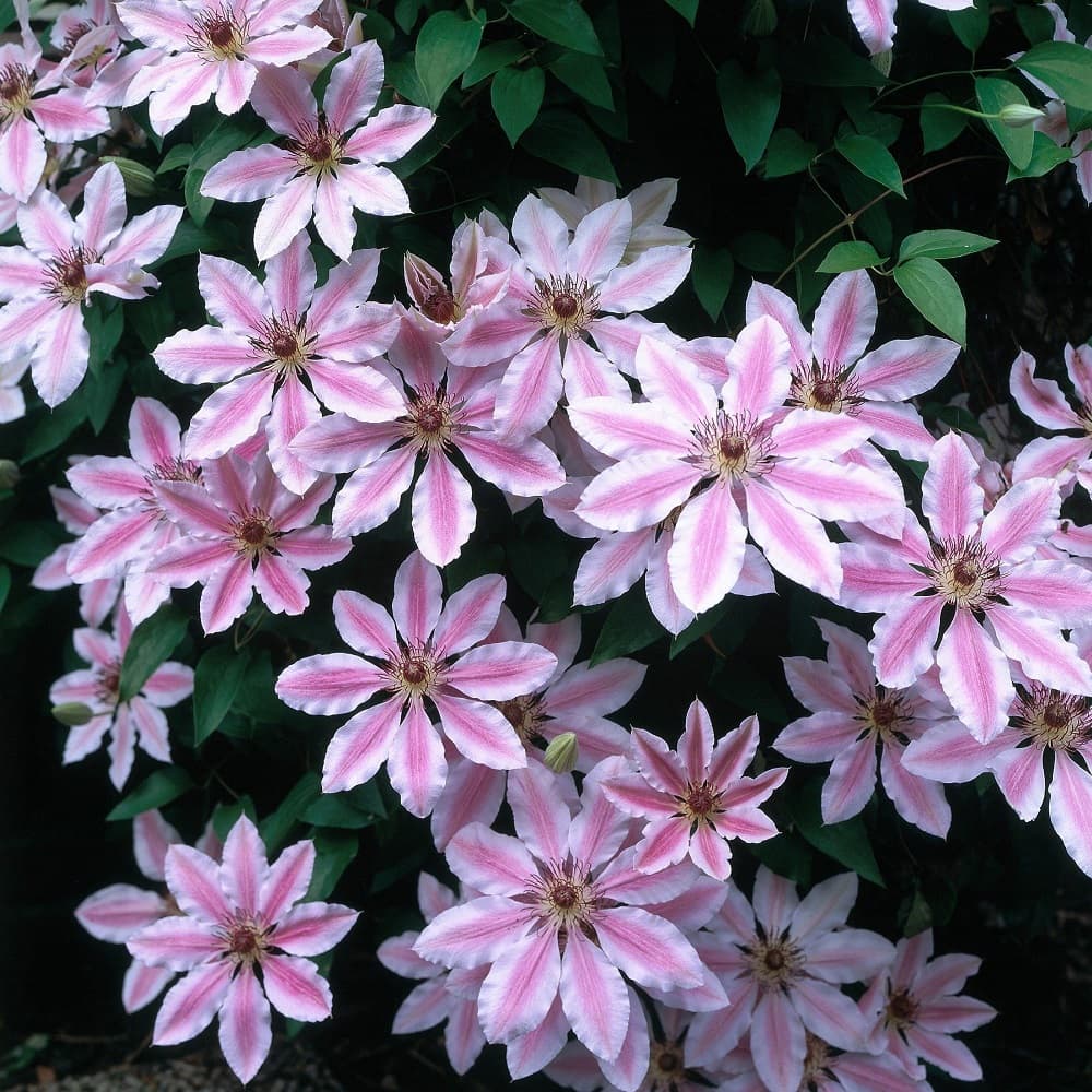 Умеренно растущий клематис Нелли Мозер соединил в себе не только нежность и яркие краски, но и удивительный контраст. Его соцветия – это светлые розово-лиловые лепестки, посередине которых проходит насыщенно-розовая полоса. Каждый бутон украшают изящные красные тычинки. Цветет Нелли Мозер настолько пышно и обильно, что порой даже сложно разглядеть за нежно-розовым «ковром» зеленые листья.