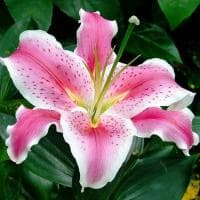 И это правда. Хоть зависть – плохое чувство, но без нее никак не обойтись при виде шикарной лилии Тибер, относящейся к восточным гибридам. Цветок действительно награжден удивительной ультрарозовой расцветкой, покрывающей упругие и слегка волнистые лепестки растения. Украшением каждого лепестка являются темные вкрапления, подобные веснушкам, рассеянными по розовым щечкам стройной девушки. Стройный метровый стебель лилии с честью выдерживает свою ношу.